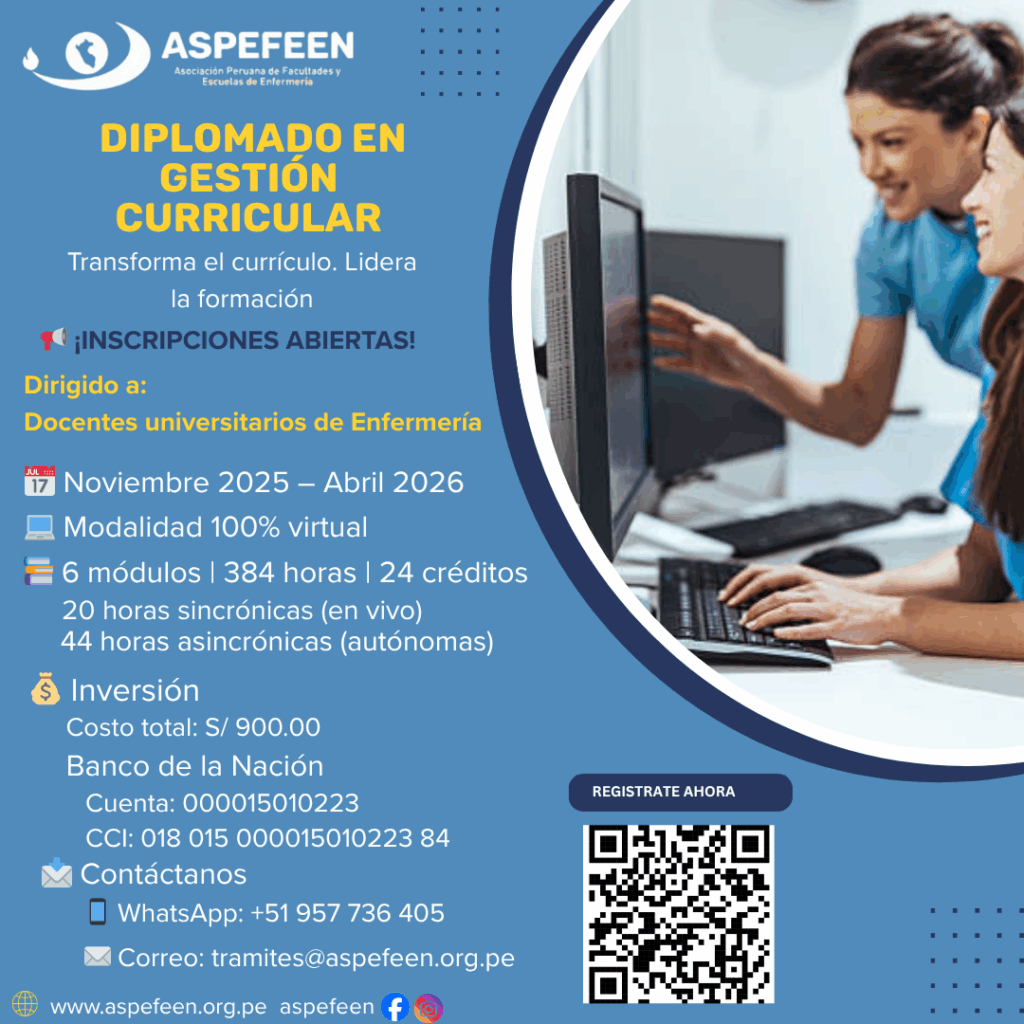 ASPEFEEN presenta el Diplomado Virtual en Gestión Curricular, una propuesta académica dirigida a profesionales de enfermería vinculados a la docencia, coordinación académica y gestión educativa. Este programa busca desarrollar competencias clave para liderar procesos curriculares con enfoque por competencias, alineados a estándares nacionales e internacionales.